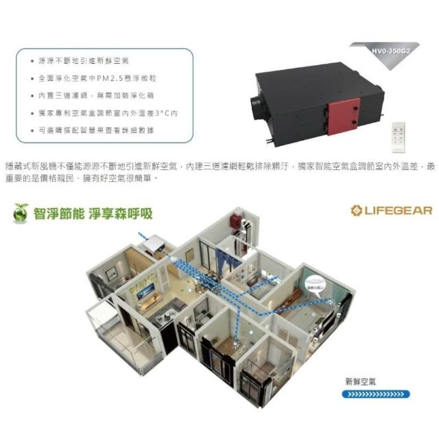 Lifegear 樂奇樂奇 隱藏式 新風機 空氣淨化 清淨 搖控 三道濾網 新風機 HEPA HVO-350G2 HVO-350C2
