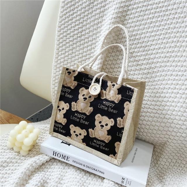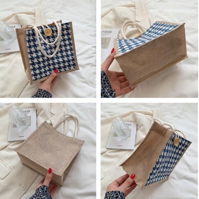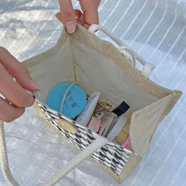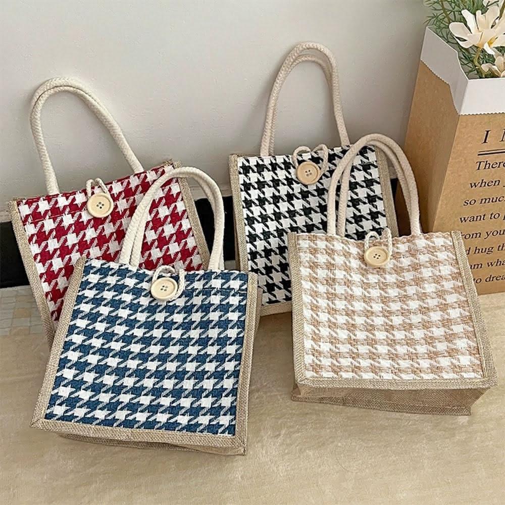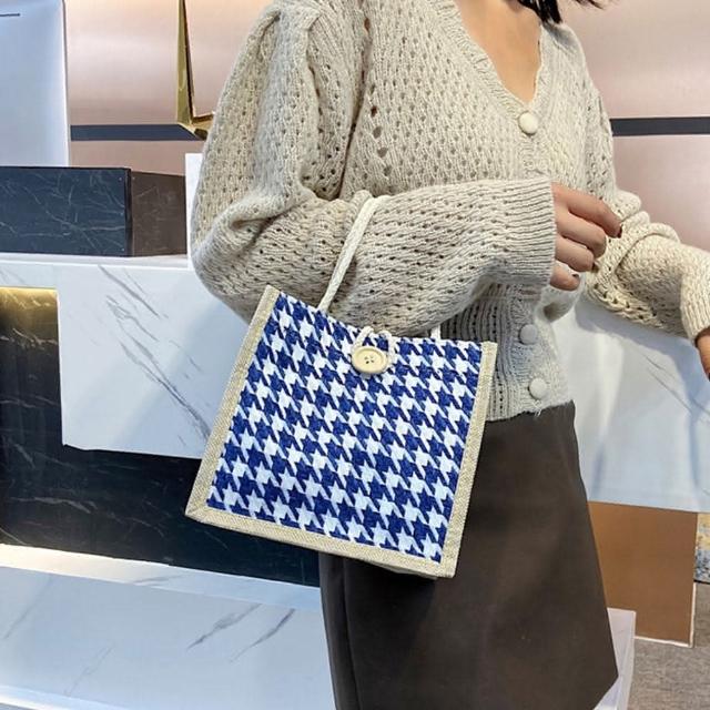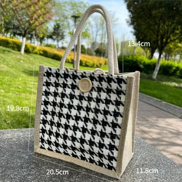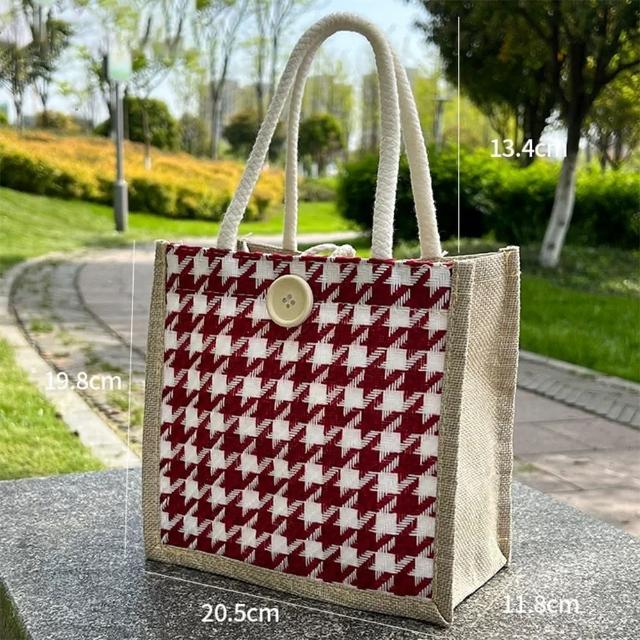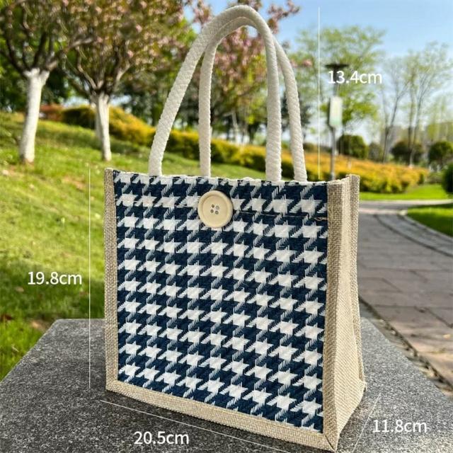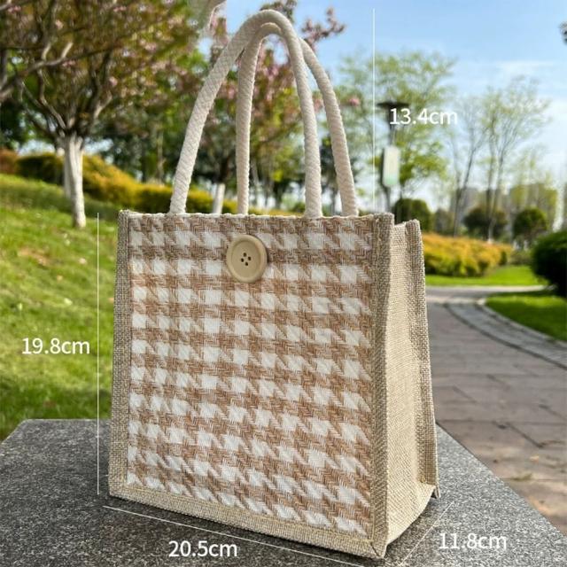 Warm House Decor 暖和家居時尚千鳥格亞麻提袋(外出輕便 小提袋 便當袋 通勤小包 麻布袋子 簡約亞麻手提包)