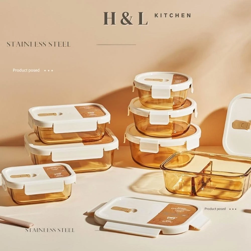 H&L 匠心優廚琥珀色玻璃保鮮盒 透明玻璃保鮮盒 耐熱玻璃便當盒 密封保鮮盒便當盒 分隔便當盒 分隔便當盒 可微波餐盒