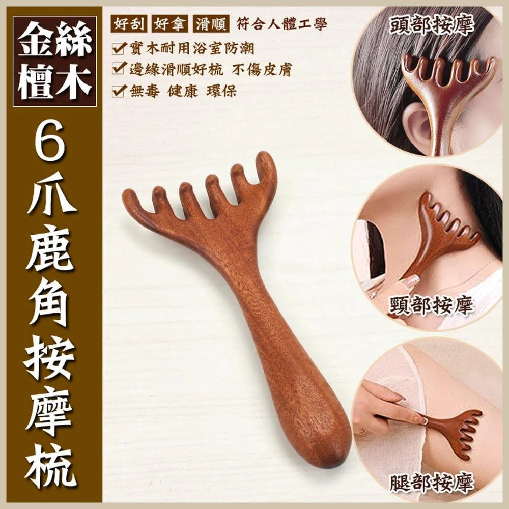 晨豐商行天然金絲檀木-6爪鹿角按摩梳 加厚加長 刮痧按摩養生梳 頭皮按摩 檀香木梳 原木梳 禮物6爪鹿角按摩梳