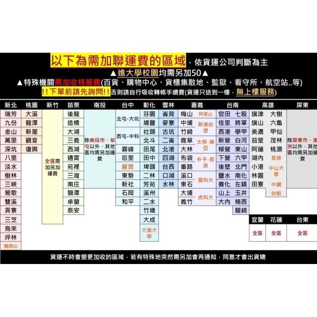 • 針對大型商品(包括:大型家電、家具床墊、健身按摩器材、車類...等),商店將於完成收款確認後,一天內〈不含例假日〉將會有專人與您確認相關配送細節等的聯繫。偏遠地區、樓層費及其它加價費用,皆由商店於約定配送時一併告知,商店將保留出貨與否的權利。