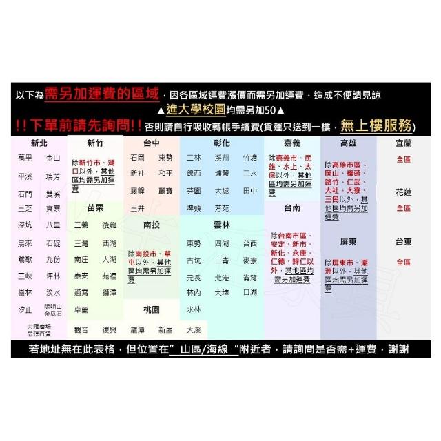 - 針對大型商品(包括:大型家電、家具床墊、健身按摩器材、車類...等),商店將於完成收款確認後,一天內〈不含例假日〉將會有專人與您確認相關配送細節等的聯繫。偏遠地區、樓層費及其它加價費用,皆由商店於約定配送時一併告知,商店將保留出貨與否的權利。