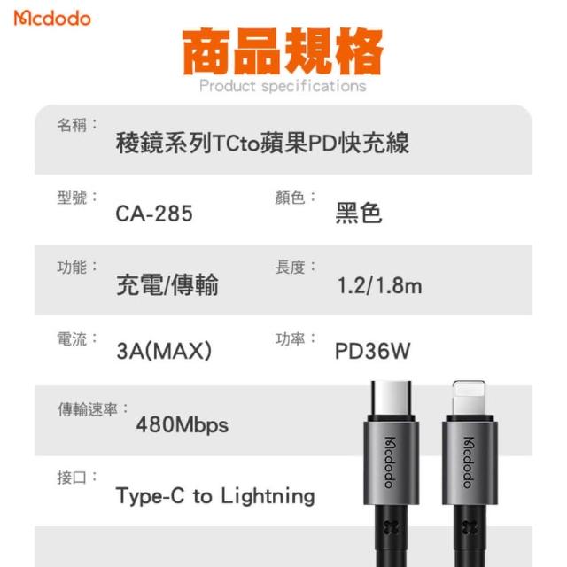 Mcdodo麥多多 稜鏡系列 Type-C to Lightning PD快充線1.2M 黑