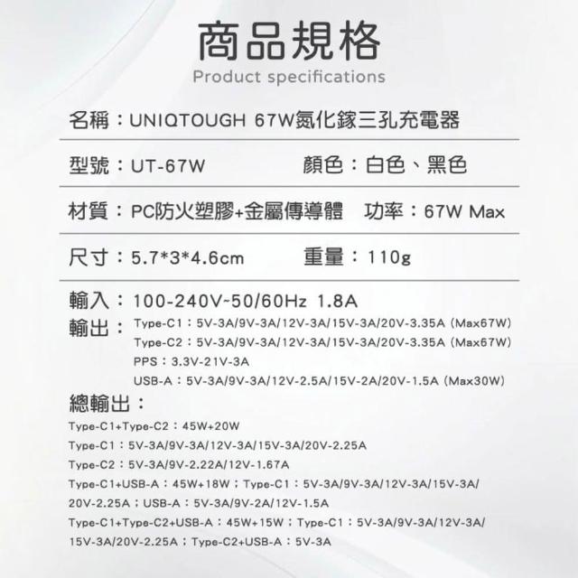 UNIQTOUGH 67W氮化鎵 三孔充電器氮化鎵