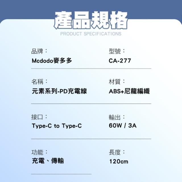 Mcdodo元素系列 Type-C to Type-C 60W 編織快充線1.2M
