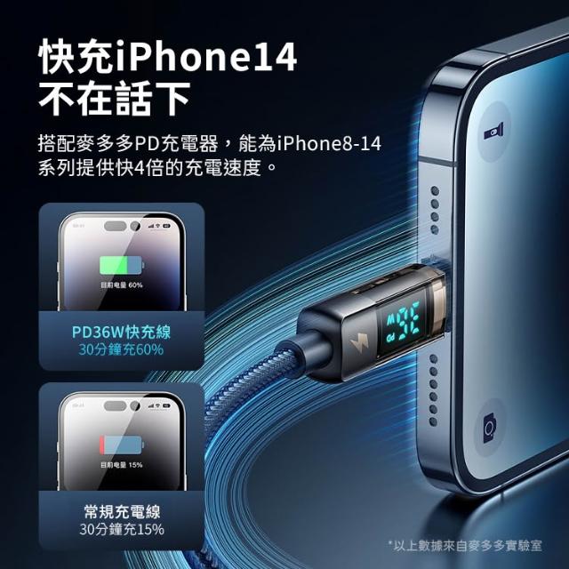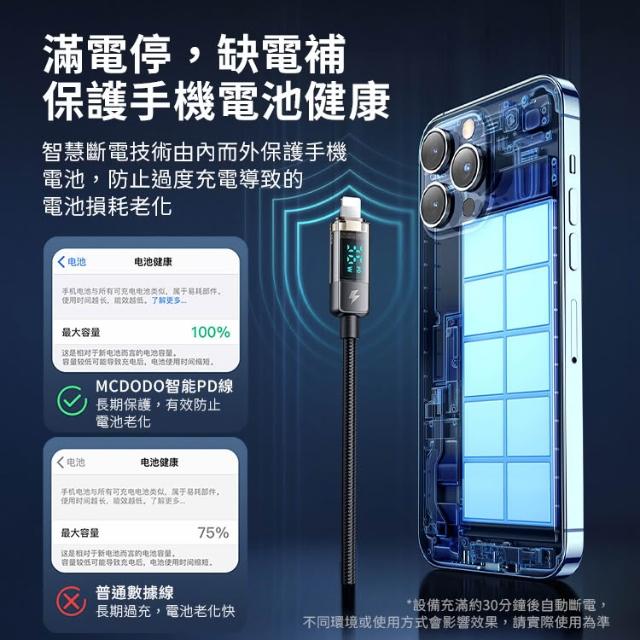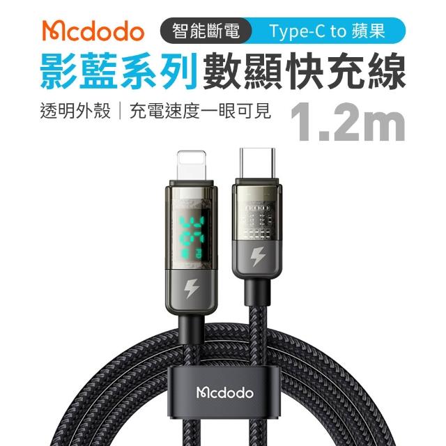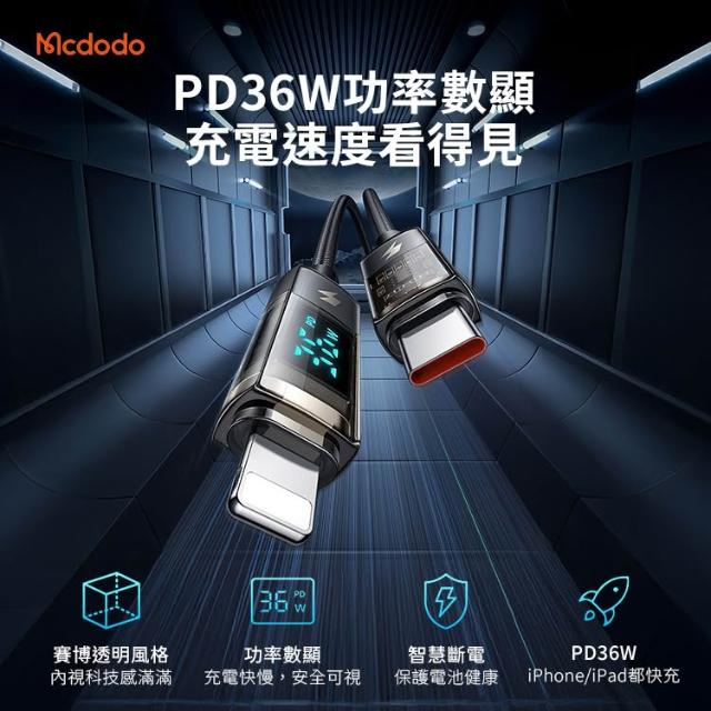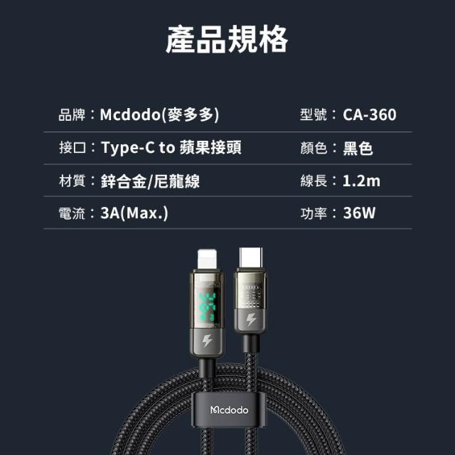 Mcdodo麥多多影藍系列數顯智能斷電36W Type-C to Lightning 快充線1.2M-黑CA-360