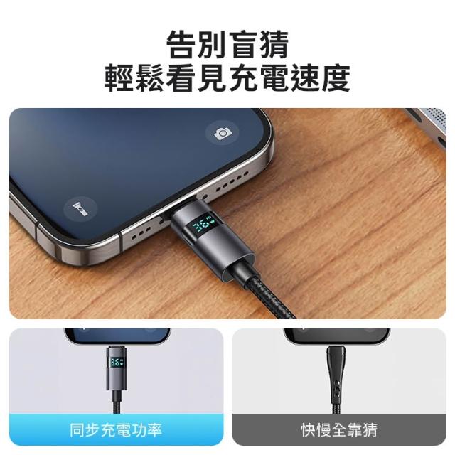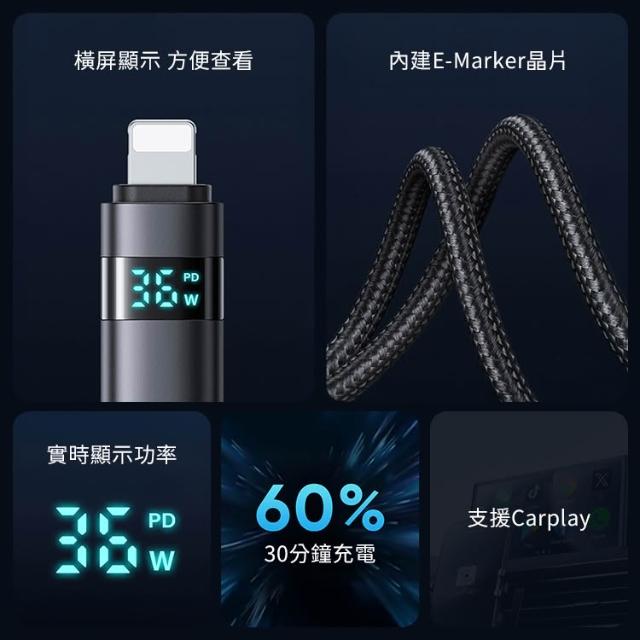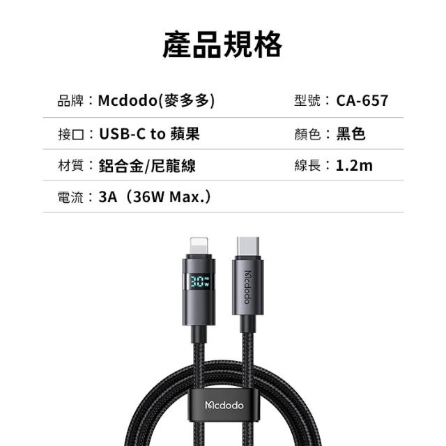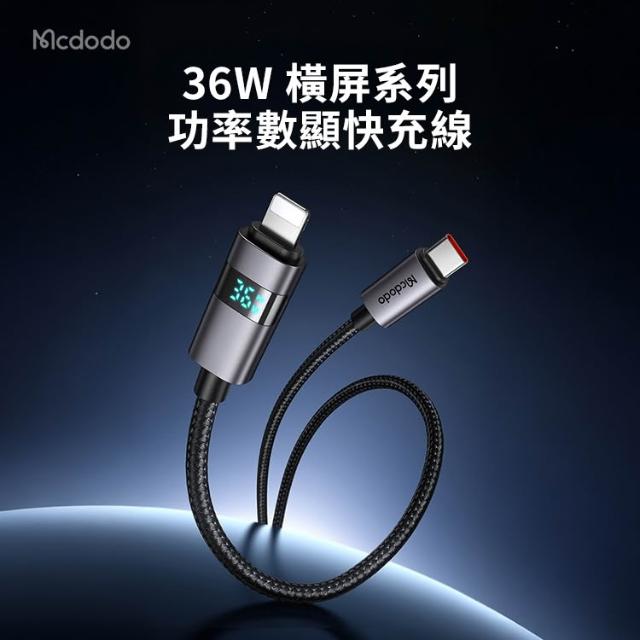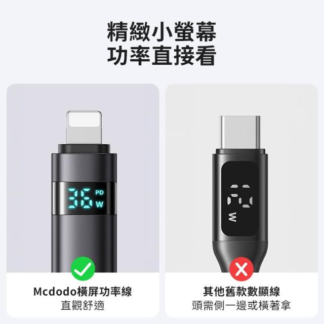 Mcdodo橫屏系列功率數顯36W Type-C to Lightning 快充線1.2M-黑CA-657
