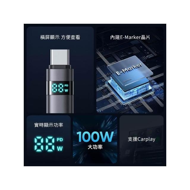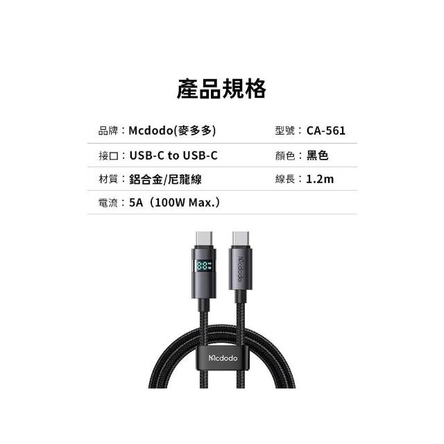 Mcdodo橫屏系列功率數顯100W Type-C to Type-C 快充線1.2M-黑CA-561
