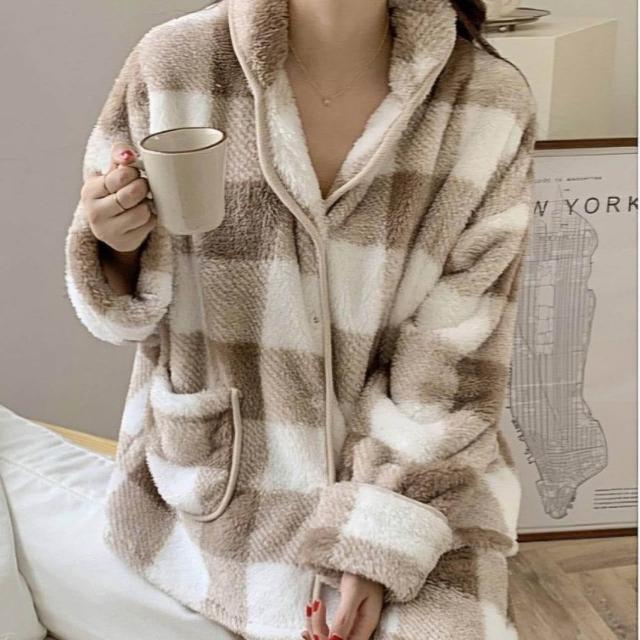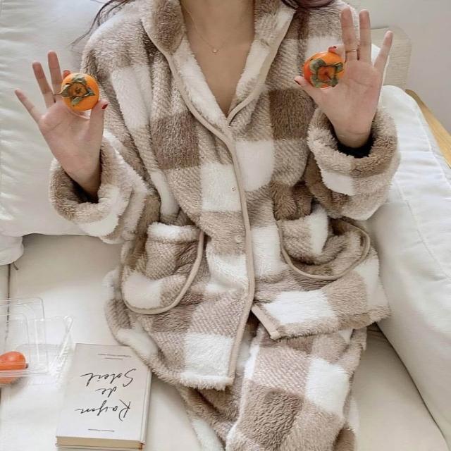 7PuPu🧸拿鐵格紋冬天睡衣(冬天居家服/冬季睡衣/上衣+長褲/女生睡衣/睡褲/保暖睡衣/外套)