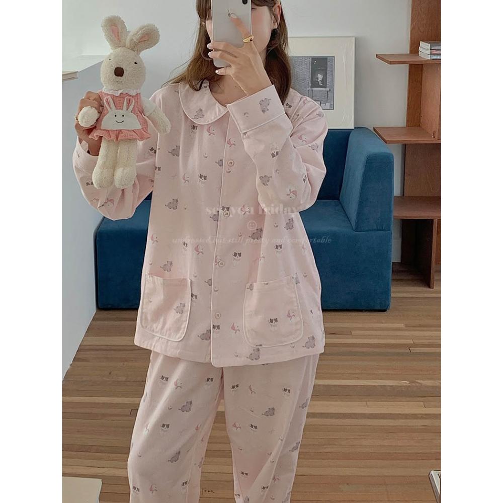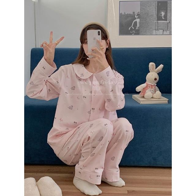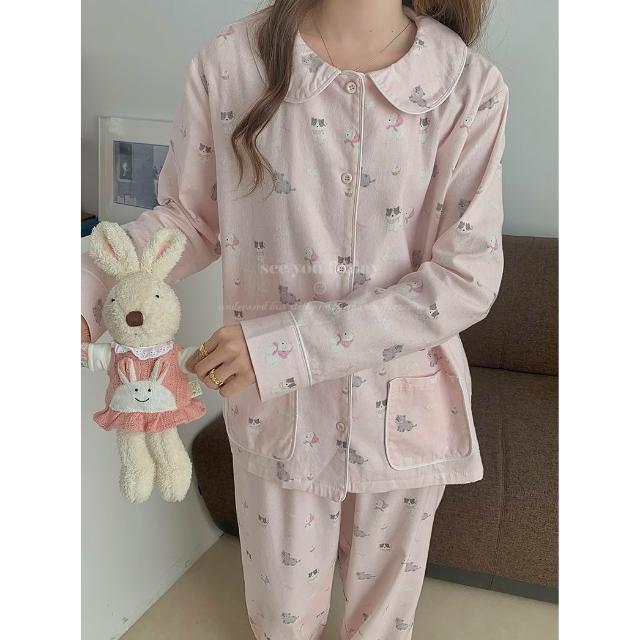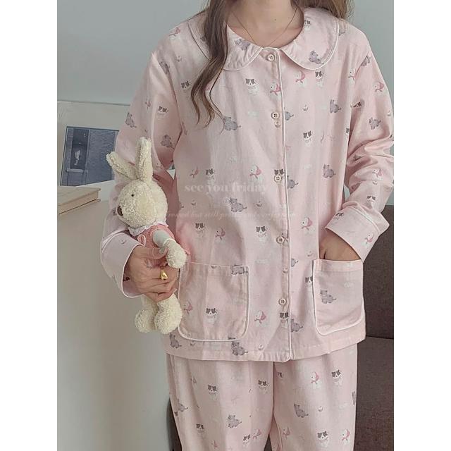 7PuPu🧸粉系少女小貓小狗全棉磨毛秋冬睡衣(冬天睡衣/保暖/女生睡褲/秋天睡衣/女生睡衣/長袖+長褲)