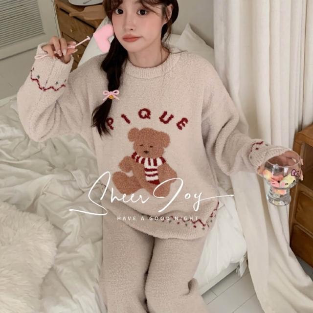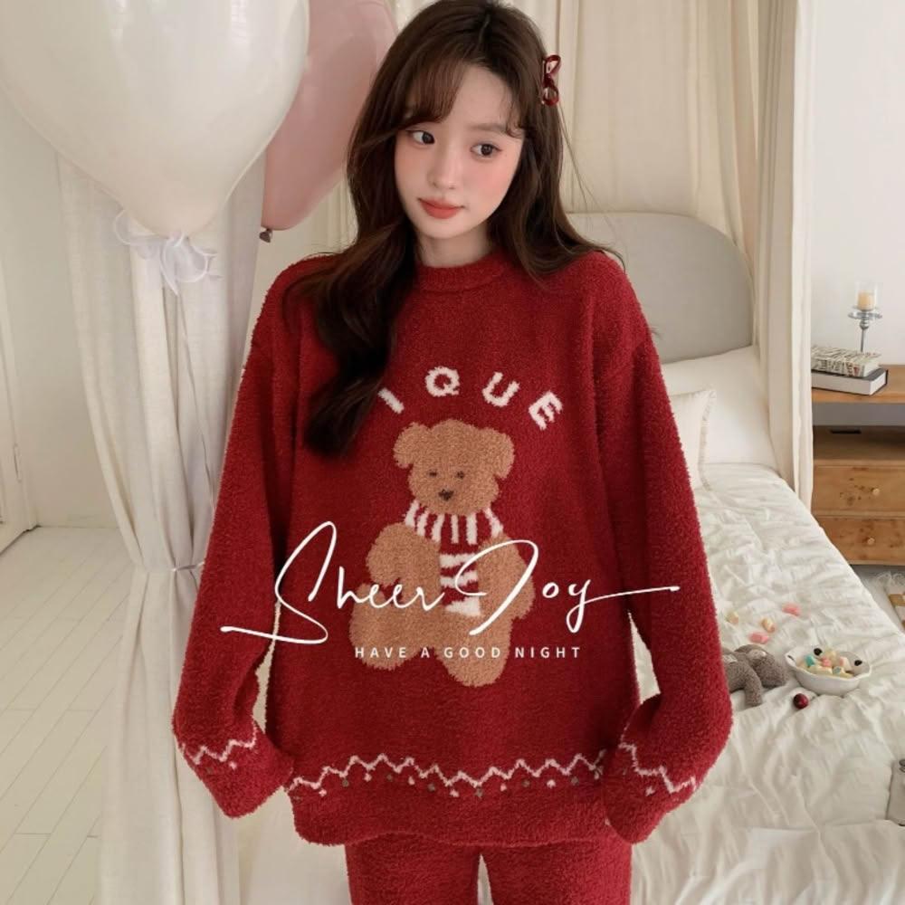7PuPu🧸聖誕圍巾小熊圓領半邊絨冬天睡衣(冬天居家服/保暖睡衣/女生睡衣/冬季睡衣/睡褲)