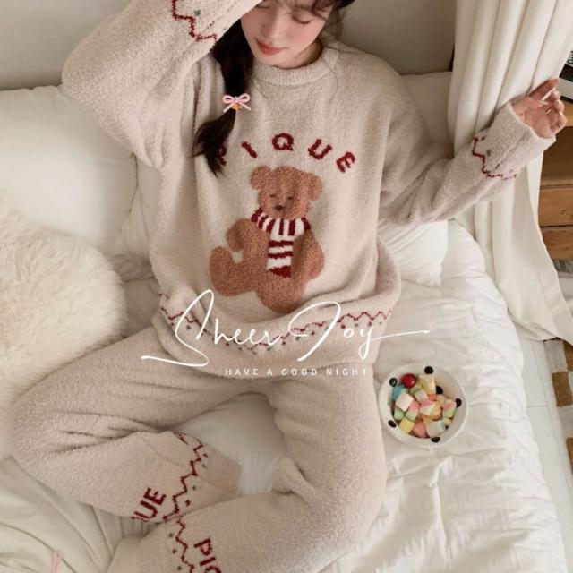 7PuPu🧸聖誕圍巾小熊圓領半邊絨冬天睡衣(冬天居家服/保暖睡衣/女生睡衣/冬季睡衣/睡褲)