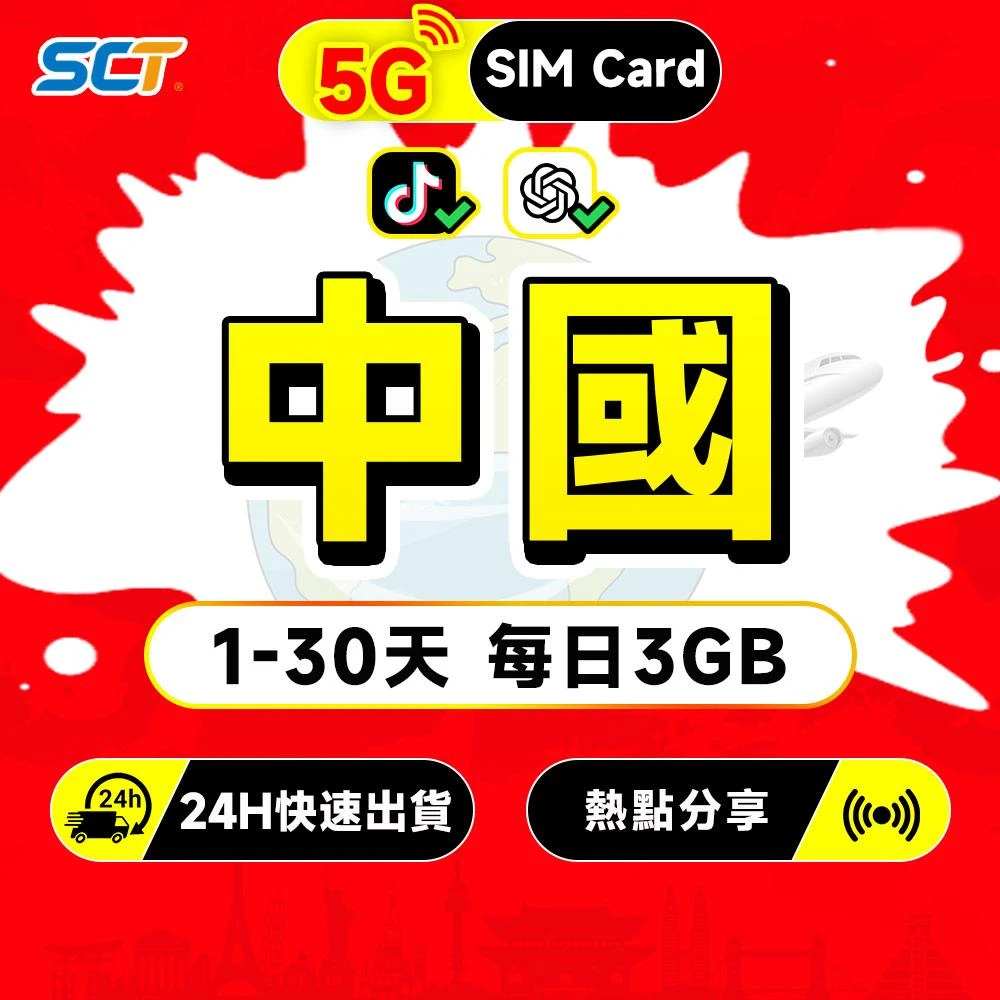 SCT中國大陸網卡每天3GB無限量吃到飽 免翻墻 中國聯通/中國電信支援LINE TikTok 大陆上網卡手機SIM卡