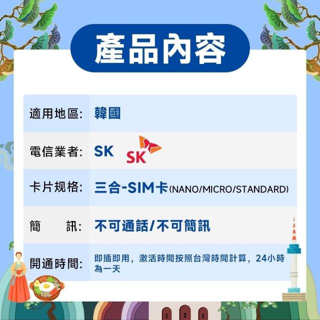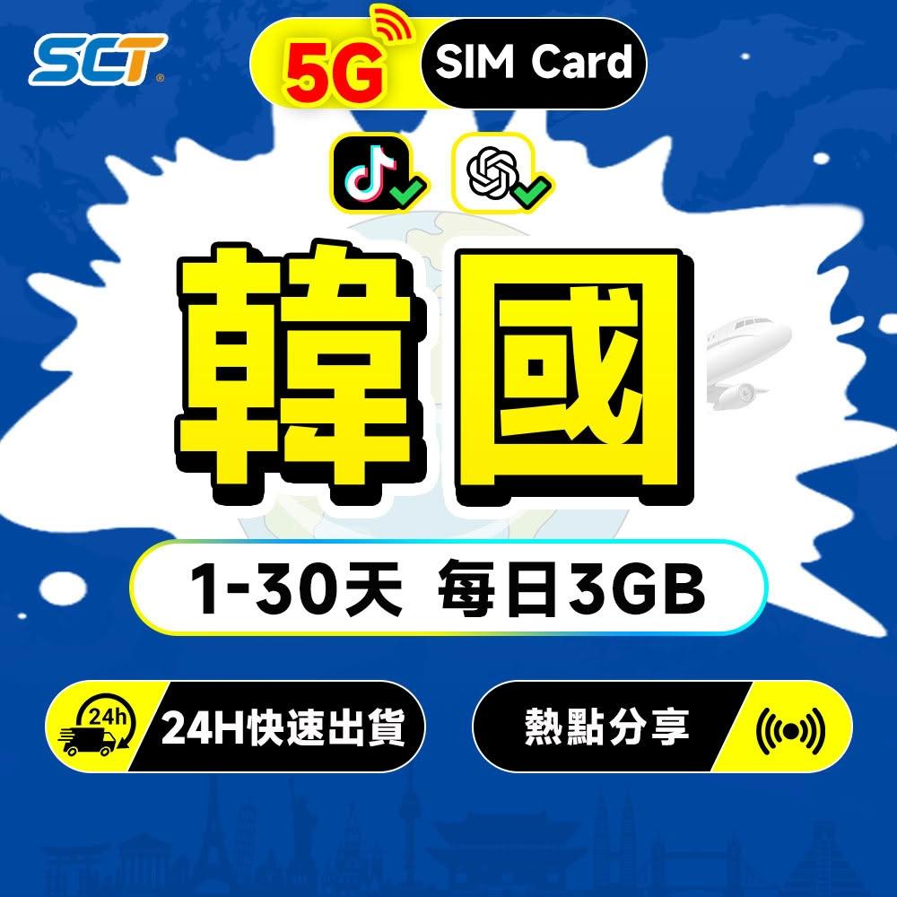 SCT韓國上網卡每天3GB無限流量吃到飽 韓國網卡 首爾 釜山 濟州島 手機上網SIM卡 韓國網路卡 支援熱點分享Tiktok