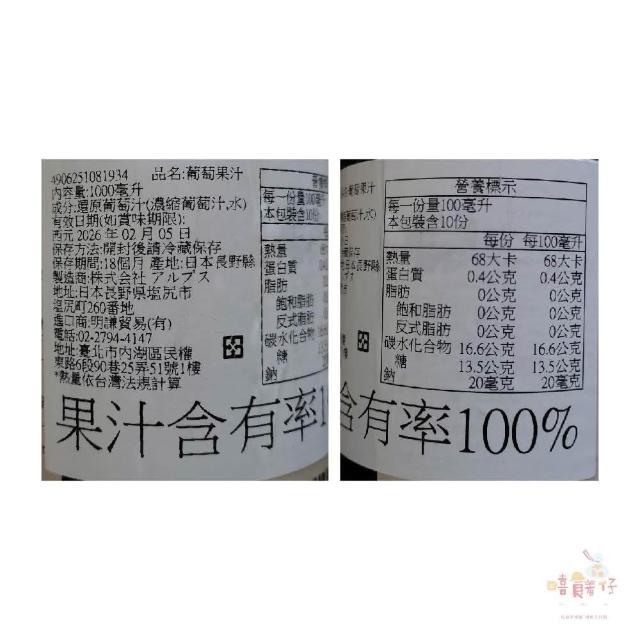 阿爾卑斯100% 紅葡萄果汁 / 白葡萄果汁 1000ml 玻璃瓶裝
