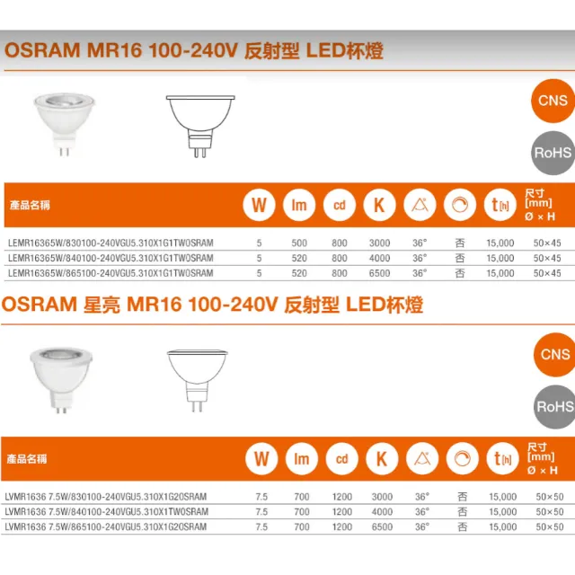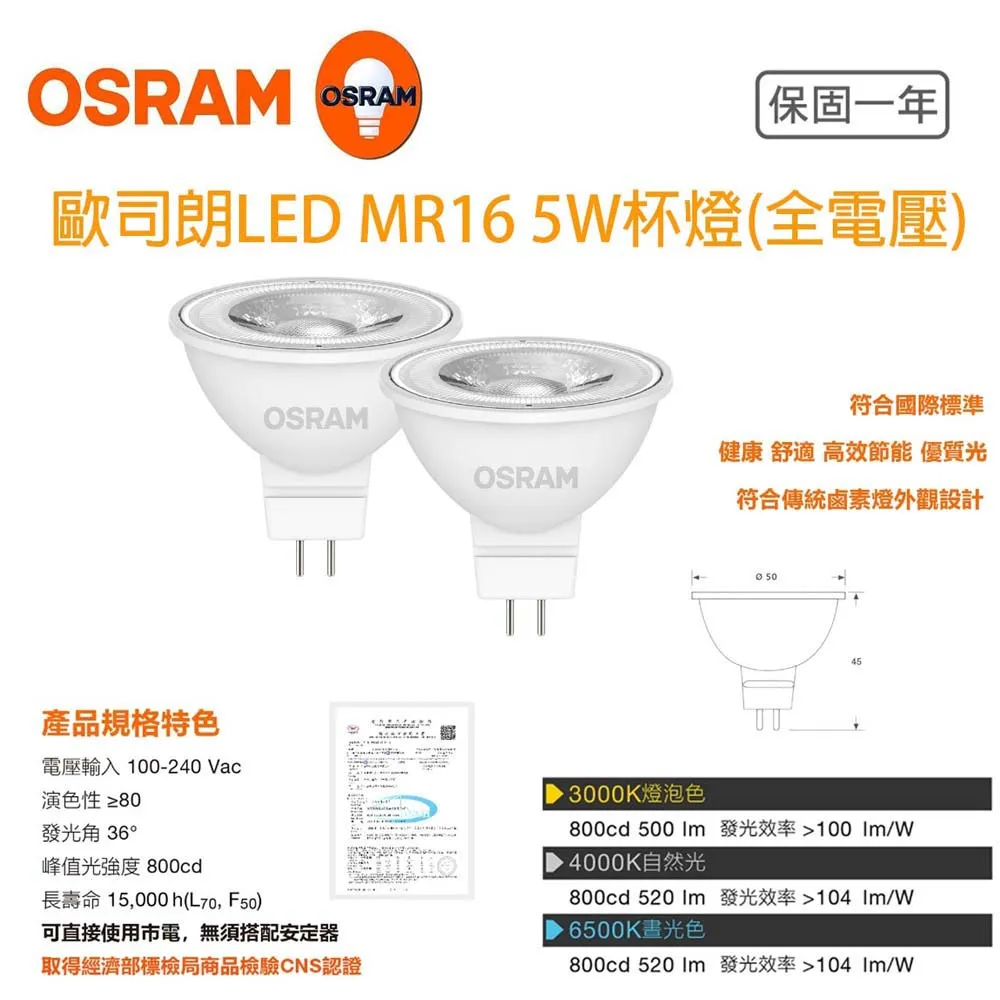 Osram 歐司朗OSRAM 歐司朗 LED 星亮 MR16 免安杯燈 5W 投射燈 免變壓器 GU5.3 全電壓 軌道投射燈(一組10個) 宗宏材料