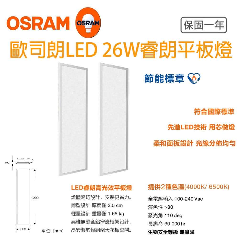 Osram 歐司朗歐司朗 OSRAM 睿朗 高光效 直下式 LED 平板燈 26W 4000K 6500K 30*120公分(一組兩入) 宗宏材料
