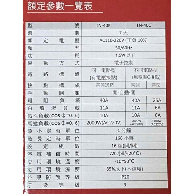 TAISHIBA 台芝一週型 電子定時器 TN-40K 大電流 附停電補償 定時器 宗宏材料
