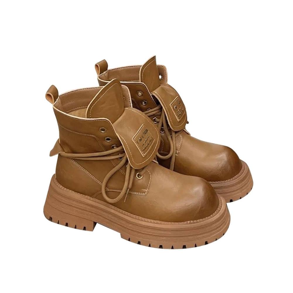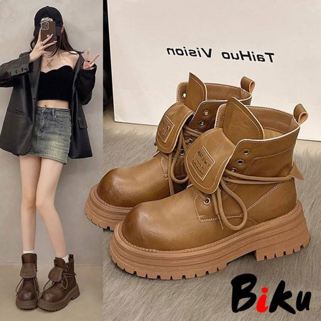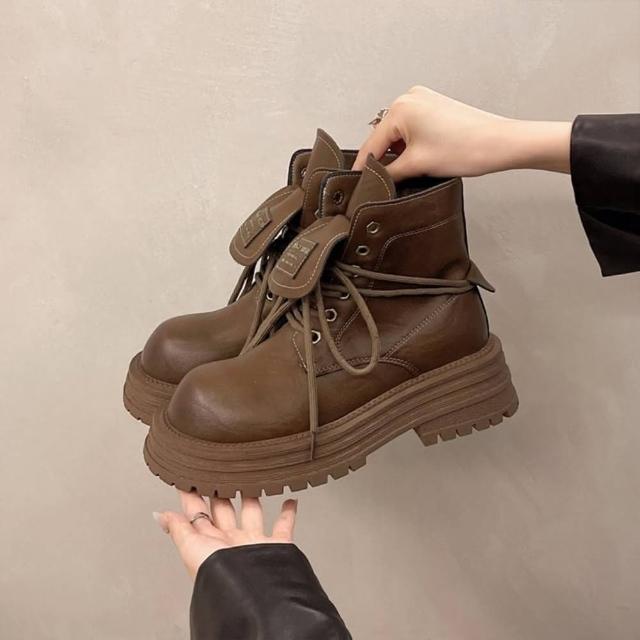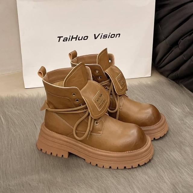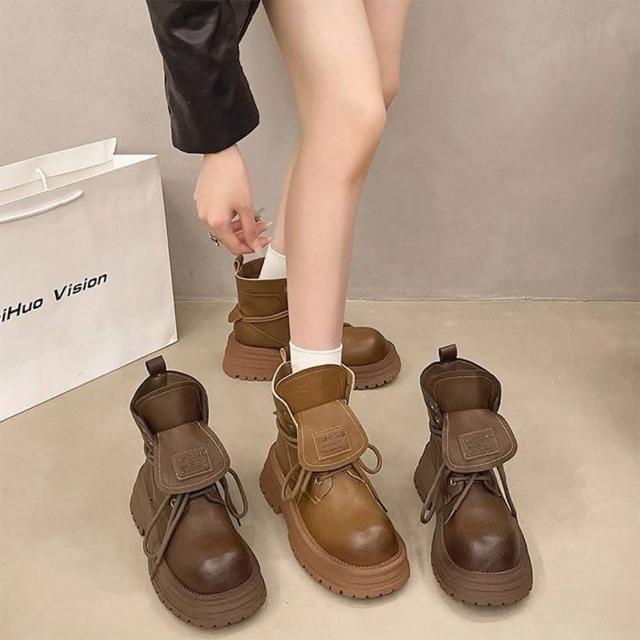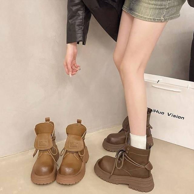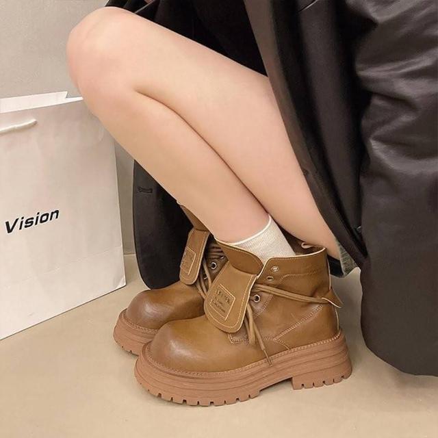韓系 夯品經典可翻蓋柔軟皮面厚底馬丁靴 馬丁粗跟短靴(馬丁靴)