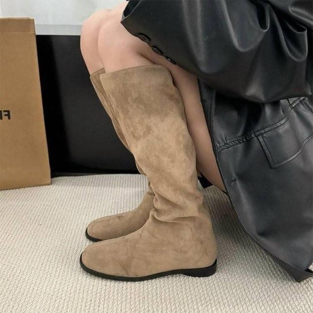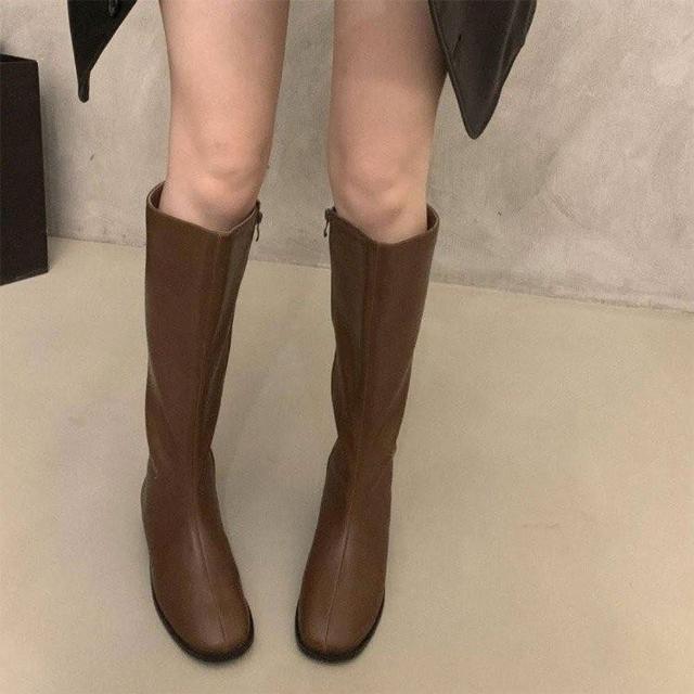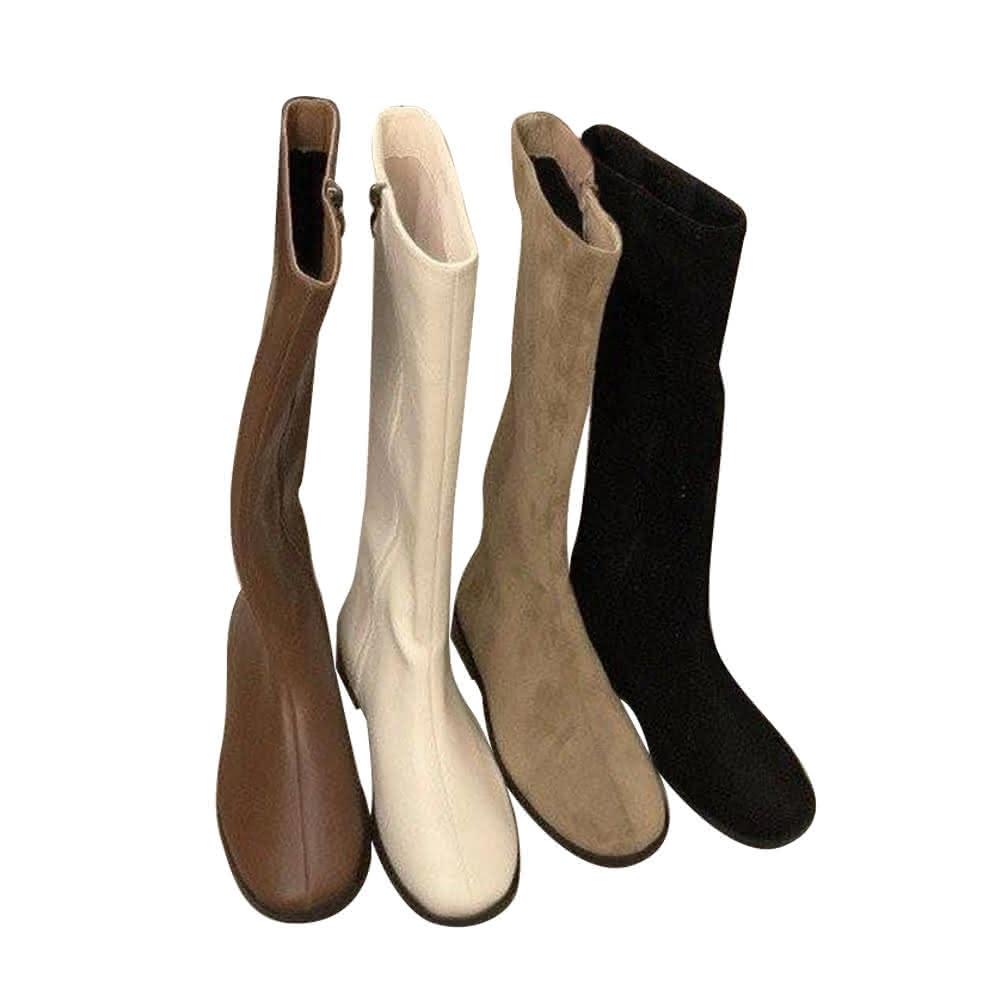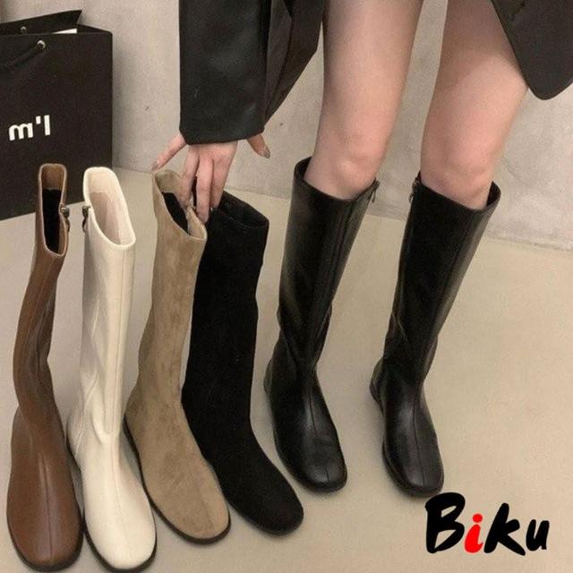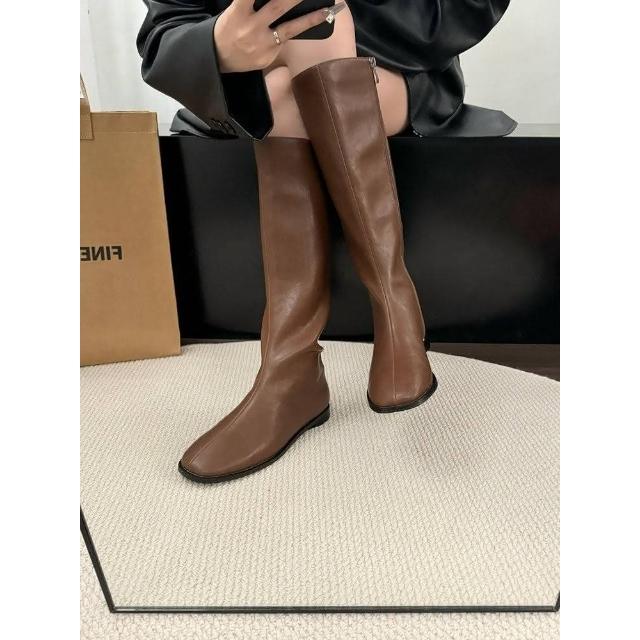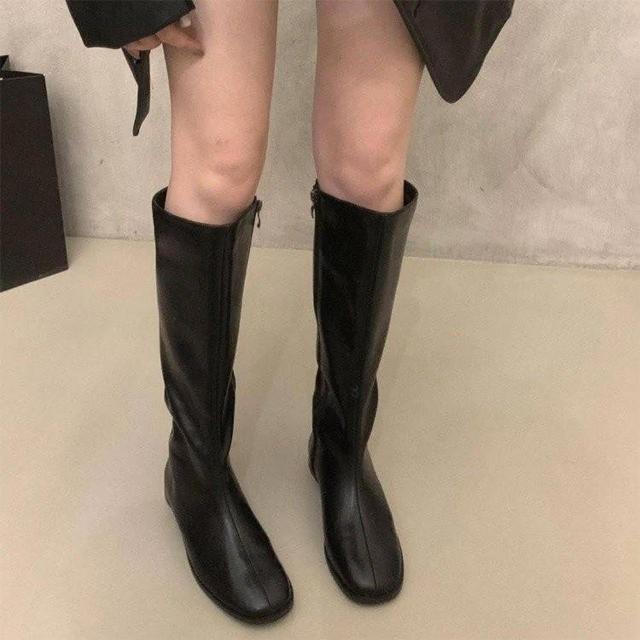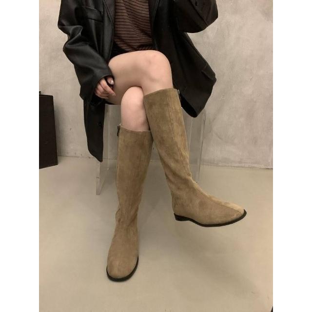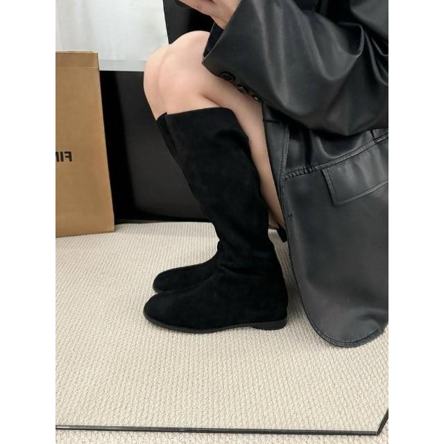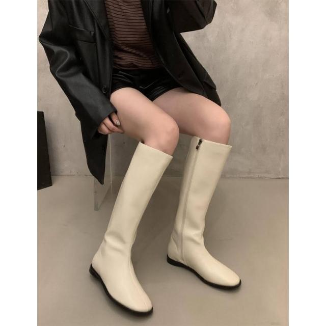 韓 絕美激瘦百搭挺版側拉鍊蛋型跟長筒靴 瘦瘦靴 平底低跟長靴