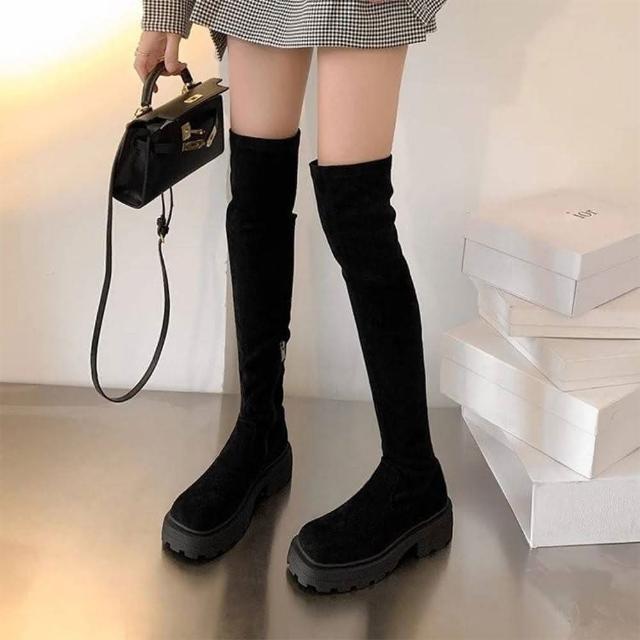 韓 完美比例 顯瘦不掉筒方糖過膝靴 彈力瘦瘦靴 厚底騎士靴