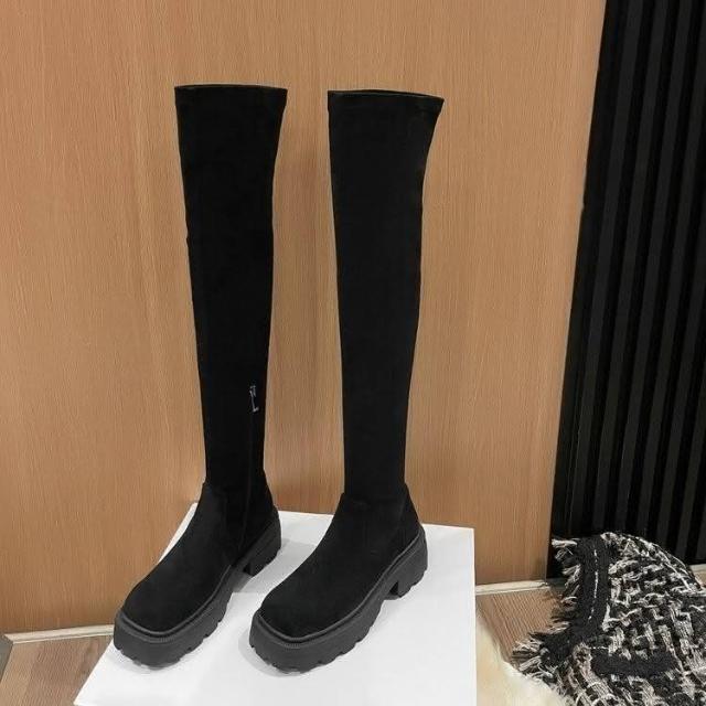 韓 完美比例 顯瘦不掉筒方糖過膝靴 彈力瘦瘦靴 厚底騎士靴