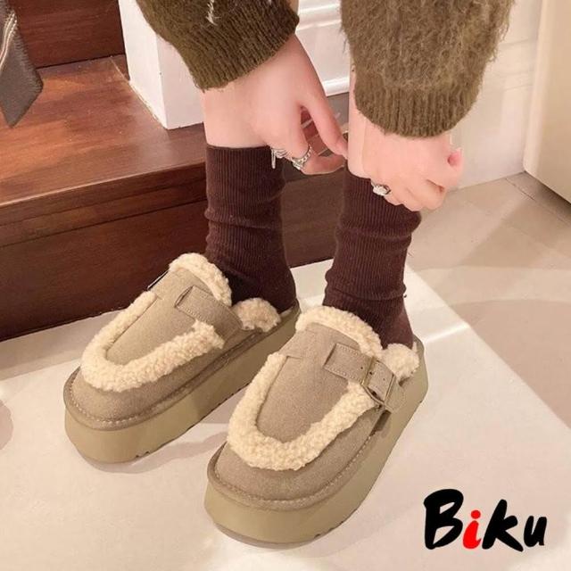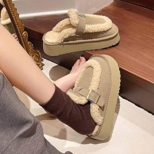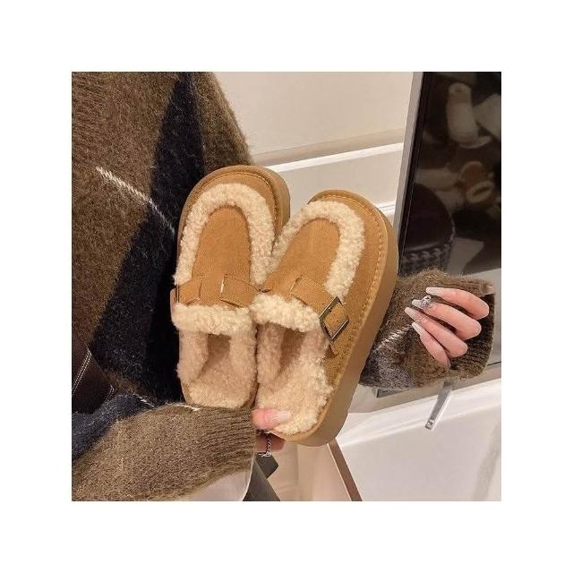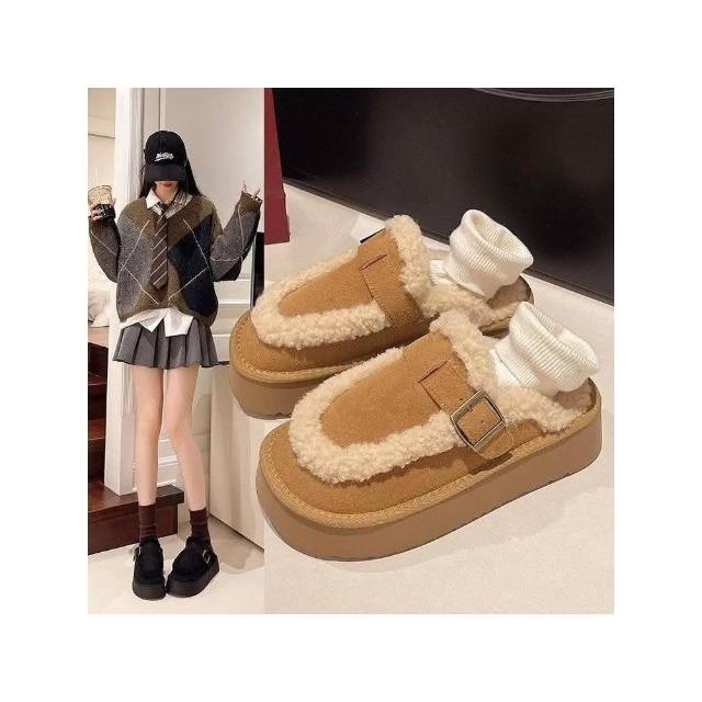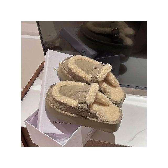 東大門 穿上加倍可愛真皮滾毛邊皮帶釦厚底雪靴拖鞋 半包鞋 保暖穆勒鞋