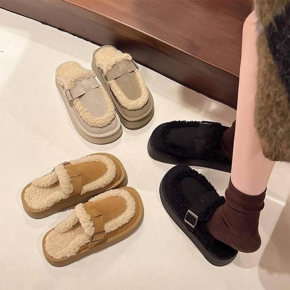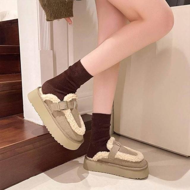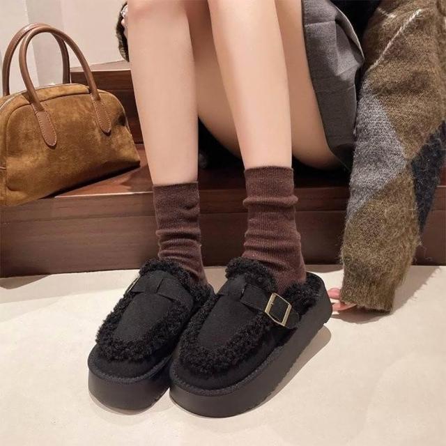 東大門 穿上加倍可愛真皮滾毛邊皮帶釦厚底雪靴拖鞋 半包鞋 保暖穆勒鞋