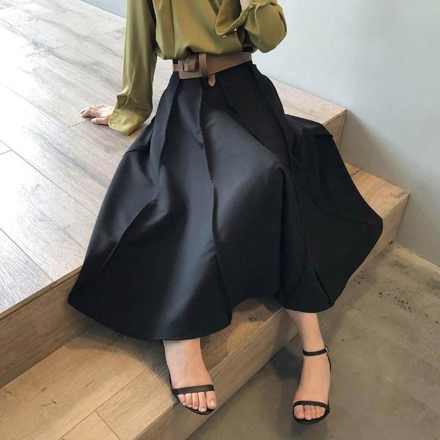 M select韓版氣質高腰百褶拼接半身裙 法式赫本風大擺A字裙 優雅傘裙 OL通勤黑色長裙