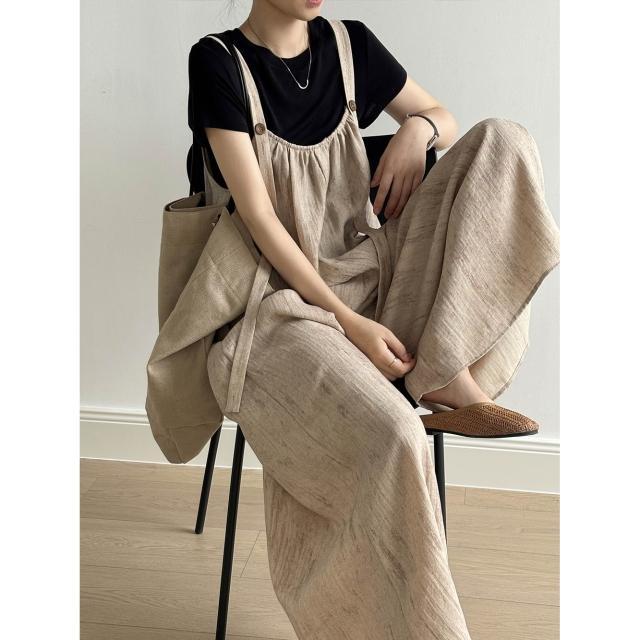 M SELECT 2025夏季新款 日系文青慵懶風 垂感亞麻背帶褲 休閒拖地連身長褲 懶人穿搭一件式吊帶褲