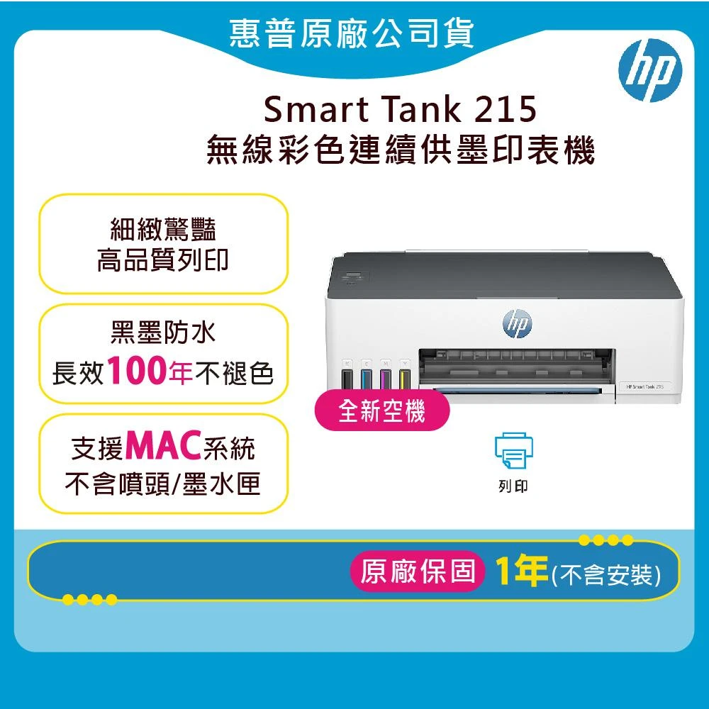 HP 惠普(全新空機不含噴頭/墨水)Smart Tank 215連續供墨無線噴墨印表機(需額外購買墨水噴頭才可以使用)
