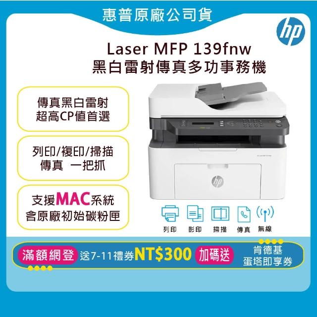 HP 惠普加碼送肯德基蛋塔券★HP MFP 139FNW 黑白雷射多功能複合機(官網登錄送7-11禮券300元)