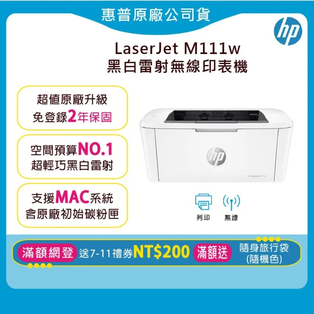 HP 惠普滿額送隨身旅行袋★ 原廠 LaserJet M111w無線黑白雷射印表機(免登錄升級2年原廠保固)