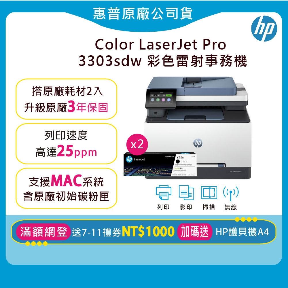 HP 惠普超值3年保1機+2黑碳匣★3303sdw 彩色雷射多功能事務機(無傳真/加碼送HP護貝機)
