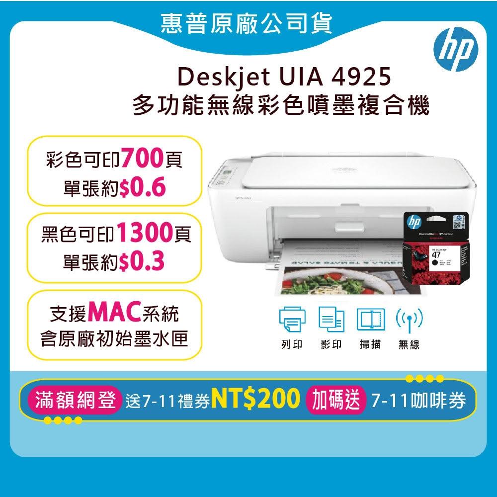 HP 惠普超值優惠組1機+1黑墨匣★ 4925 多功能無線彩色噴墨複合機(加碼送7-11咖啡券/網登送7-11禮券200元)