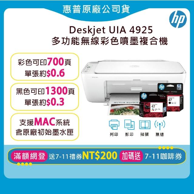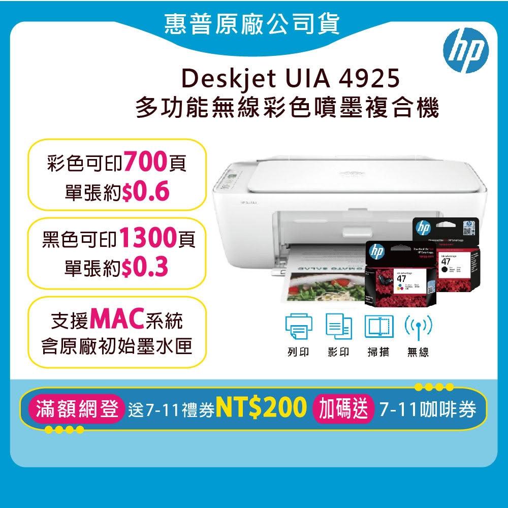 HP 惠普超值2年保組1機+1黑1彩墨匣★ 4925 多功能無線彩色噴墨複合機(加碼送7-11咖啡券/網登送7-11禮券200元)