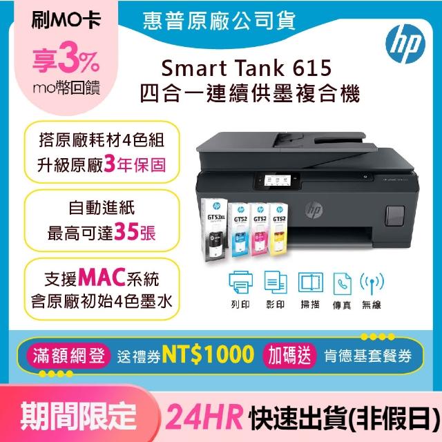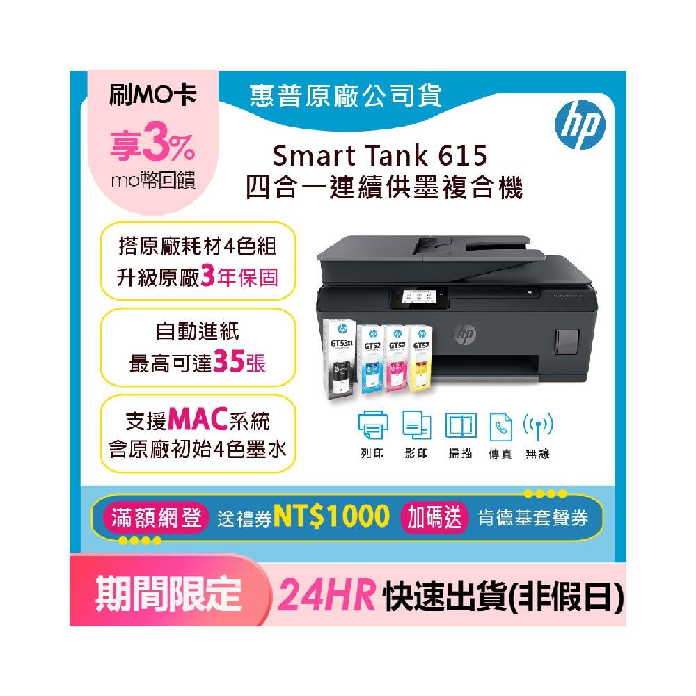 HP 惠普超值3年保組1機+4墨★原廠Smart Tank 615 多功能連供無線事務機傳真機(加碼送肯德基套餐券)