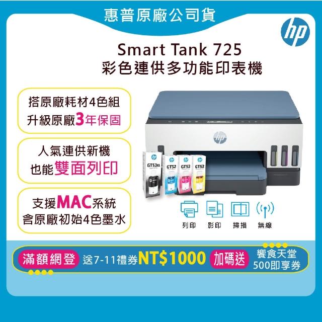 HP 惠普超值3年保組1機+4墨★ SmartTank 725 無線連續供墨噴墨印表機(加碼送饗食天堂500即享券)