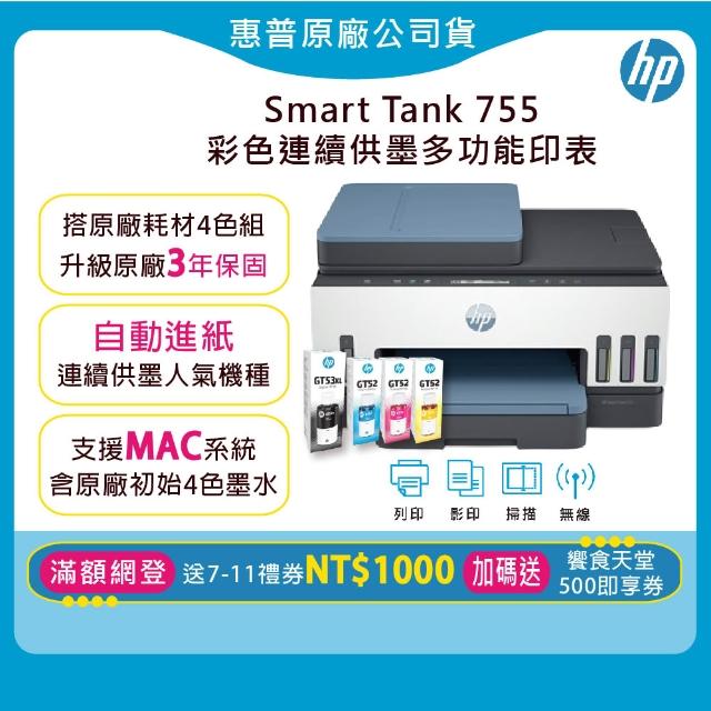 HP 惠普超值3年保組1機+4墨★ SmartTank 755 三合一無線連供多功能印表機(加碼送饗食天堂500即享券)