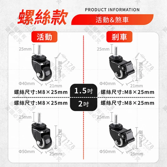 178小舖活動腳輪 1.5吋 2吋(板車輪子 萬向輪 推車輪子 輪子 滑輪 活動輪 推車輪 電腦椅輪子)
