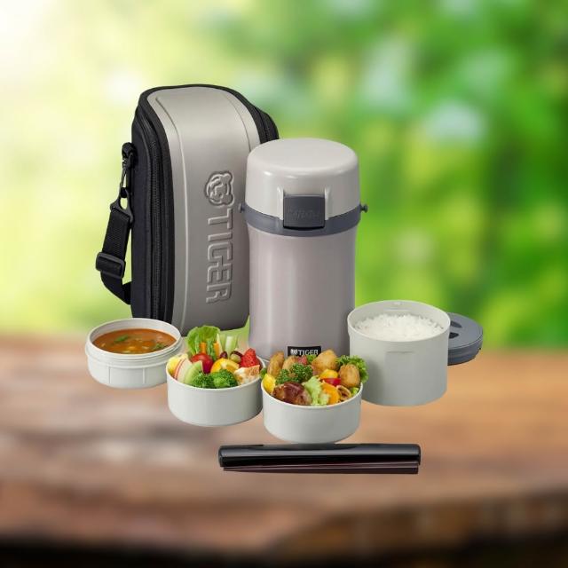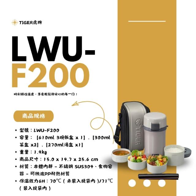 TIGER 虎牌不鏽鋼保溫飯盒 LWU-F200 3碗飯|雙菜盒大容量 微波可用 附提袋筷子 真空斷熱 不易殘溜污漬