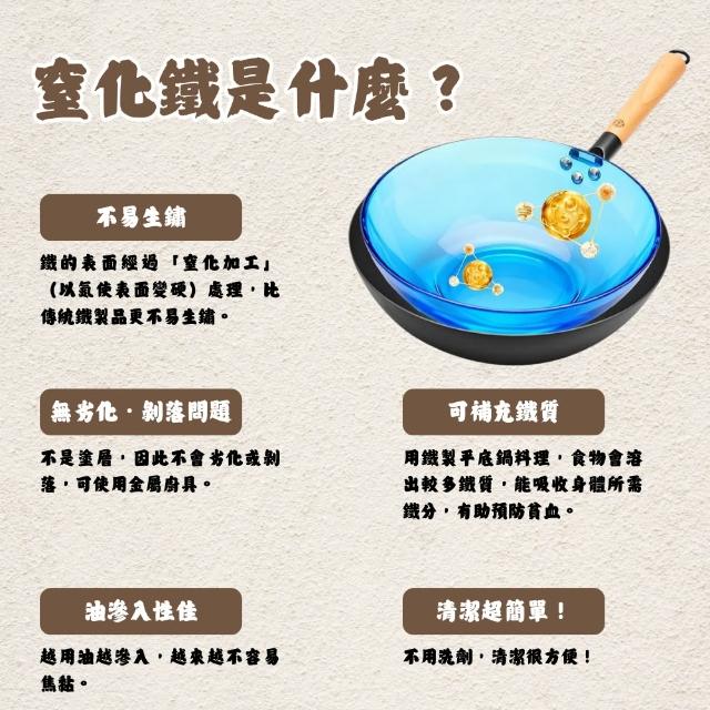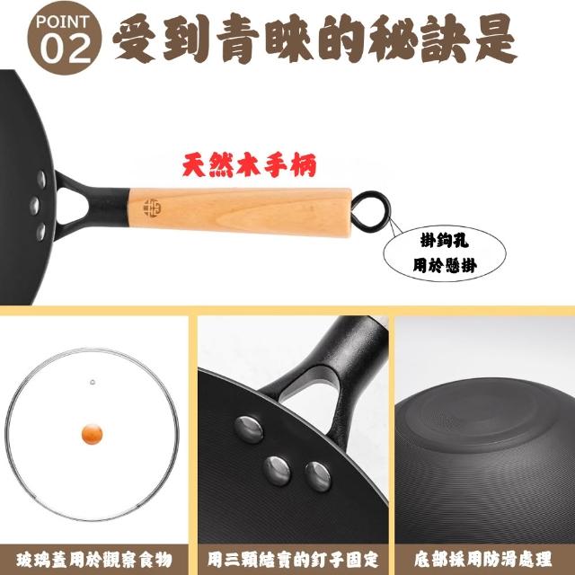 王源吉32cm窒化鐵製中式炒鍋|無塗層不易生鏽 附玻璃蓋 木柄防滑 IH瓦斯通用 氮化鐵製
