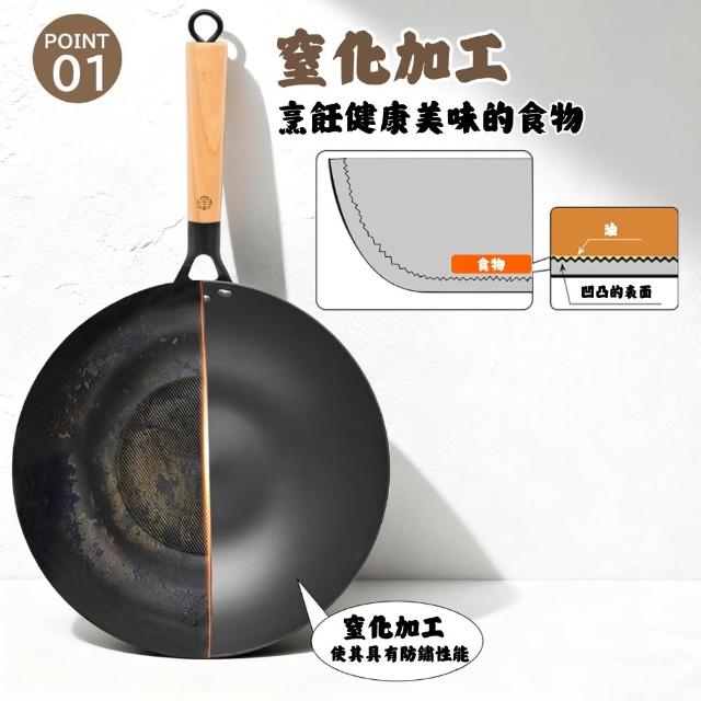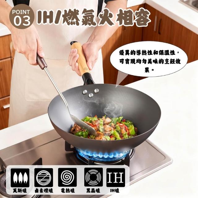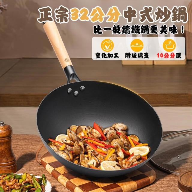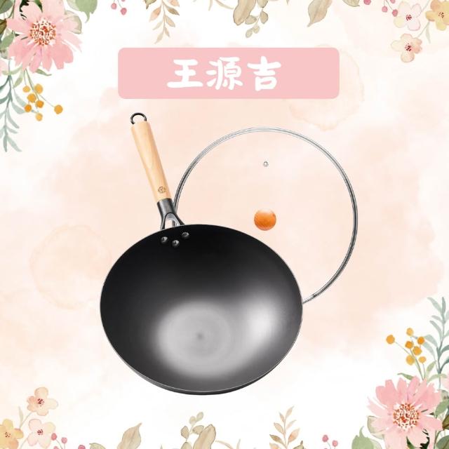 王源吉32cm窒化鐵製中式炒鍋|無塗層不易生鏽 附玻璃蓋 木柄防滑 IH瓦斯通用 氮化鐵製