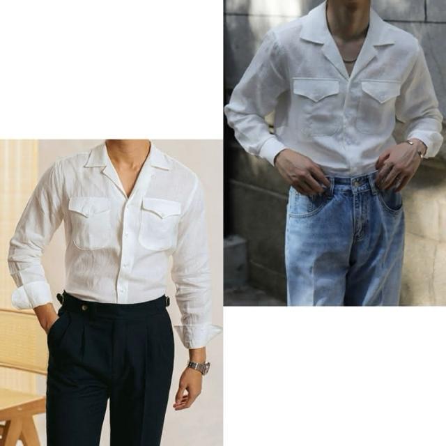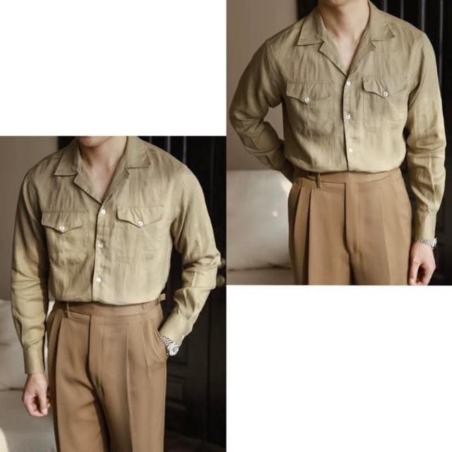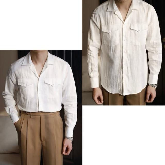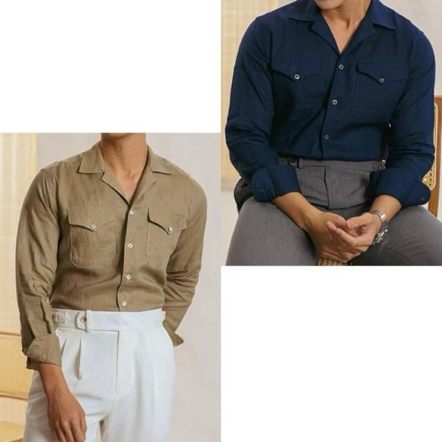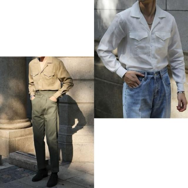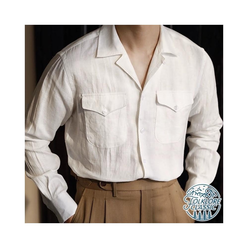Folklore Classic 三色 春夏清爽亞麻棉蓋袋古巴領遊獵長袖襯衫 亞麻襯衫