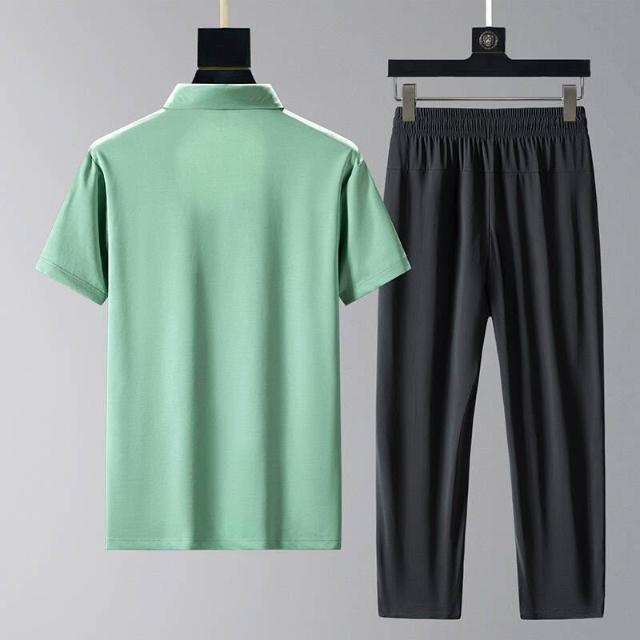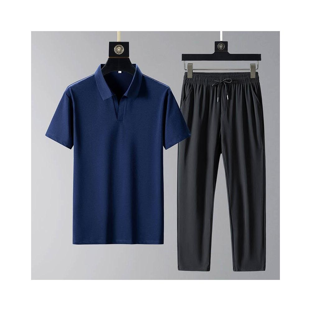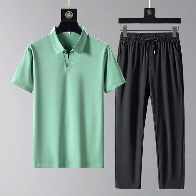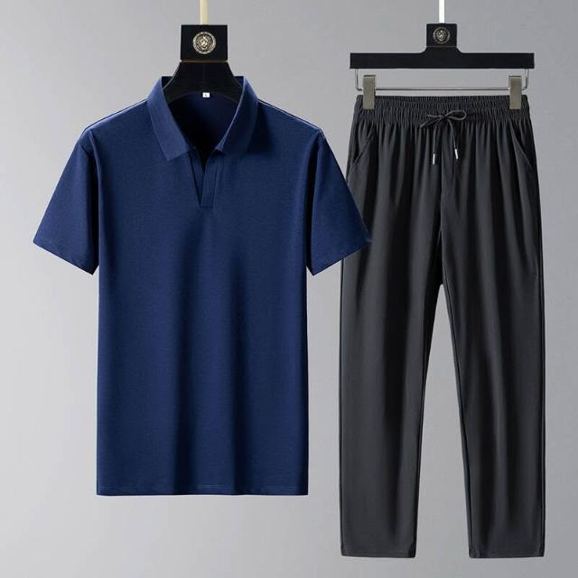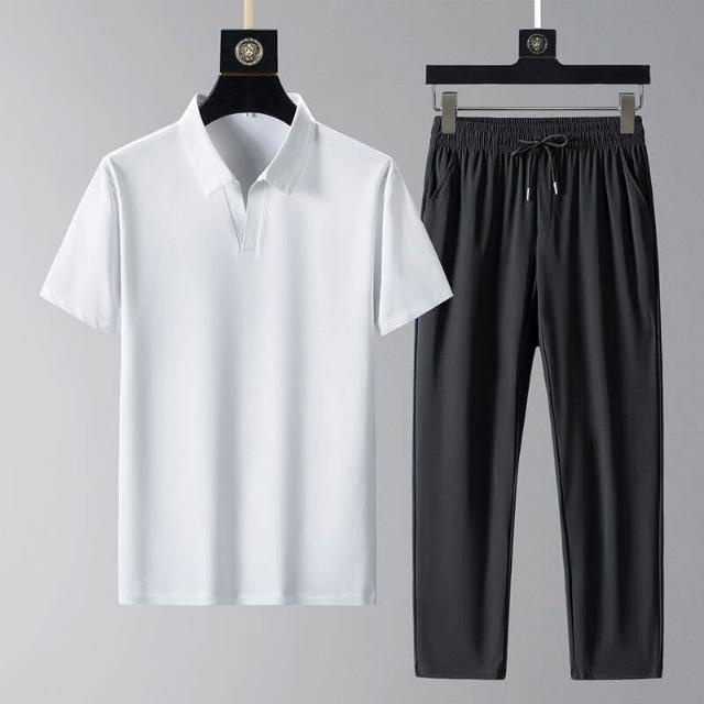 運動套裝男polo衫短袖上衣大尺碼涼感衣長褲薄吸濕排汗衣冰絲短袖T恤褲子休閒套裝羽球衣服男生高爾夫球衣登山透氣速乾長褲 中年爸爸男裝兩件套居家舒適套裝跑步健身衣夏天寬鬆t恤防曬褲運動男寬褲兩件式套裝