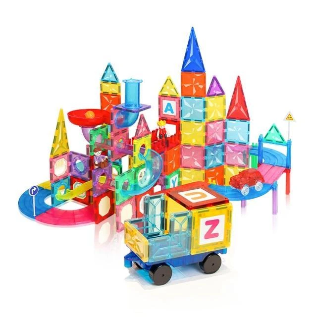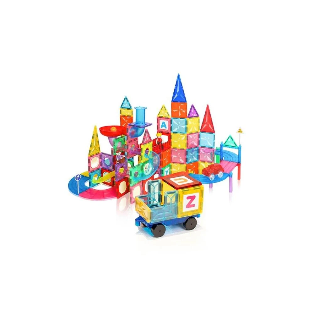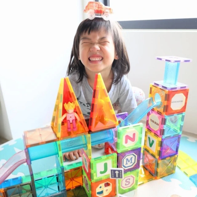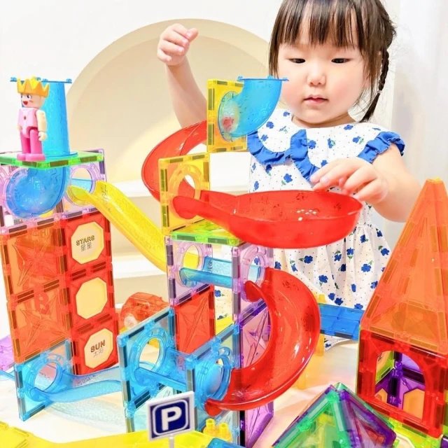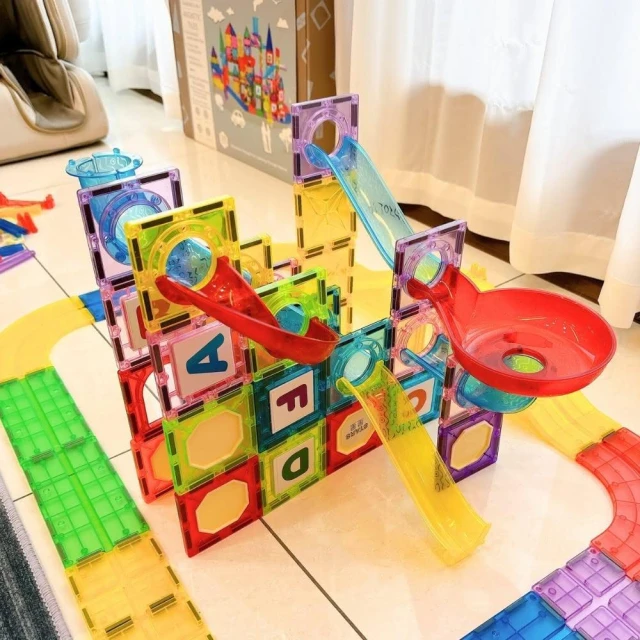 i-Smart聰明媽咪 彩窗透光磁力積木三合一180片(積木+小汽車軌道+小球管道玩樂) 磁力建構片 磁力片軌道車 磁力片積木