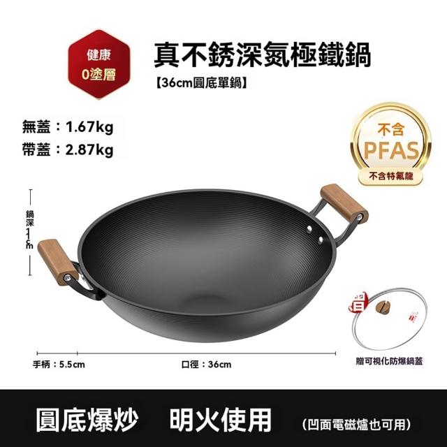 STAR·U星優品牌店 大肚鍋 鐵鍋 炒菜鍋 炒鍋 深炒鍋 爆炒鍋 無塗層不粘鍋 煮鍋 深氮極鐵鍋(防燙櫸木手柄/贈送鍋蓋/燃氣竈電磁爐通用)