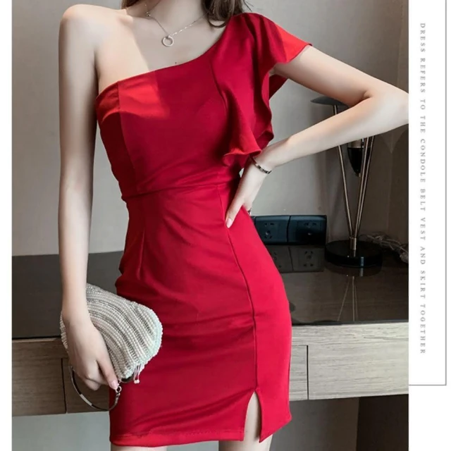 臧女皇斜肩禮服小洋裝緊身禮服露肩禮服 主持人直播服裝 正式穿搭