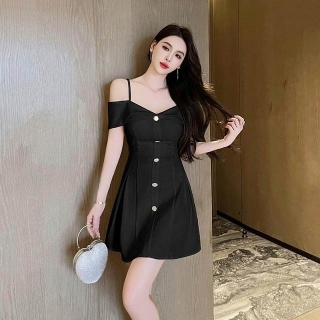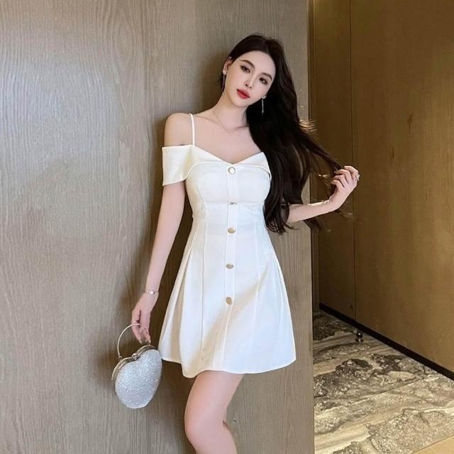 - 洋裝一字肩小禮服吊帶連衣裙白色