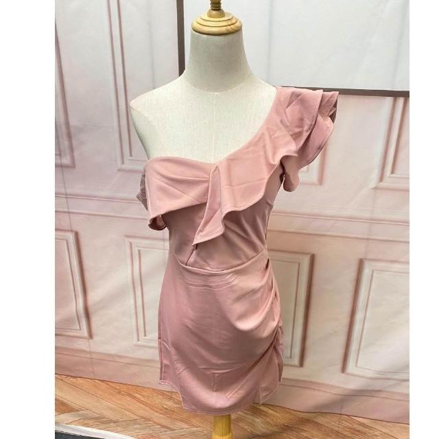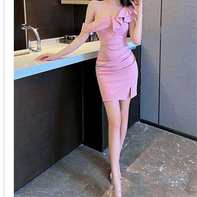 - 小禮服不對稱拼接荷葉領開衩緊身